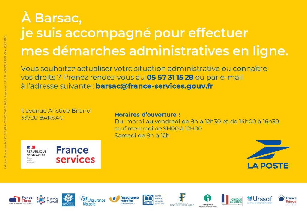Au-delà des services de La Poste, les clients pourront bénéficier des services de différents opérateurs, comme Pôle emploi, la CNAM, la MSA, la CAF, la CNAV, la DGFiP, et les services des ministères de la Justice et de l’Intérieur. Auparavant, La Poste de Barsac accueillait une Maison de Services au Public.
