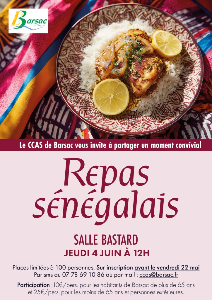 Le CCAS de Barsac vous invite à partager un moment convivial jeudi 4 juin à la salle Bastard à 12h.Participation :10€/pers. pour les habitants de Barsac de plus de 65 ans et 25€/pers. pour les moins de 65 ans et personnes extérieures.