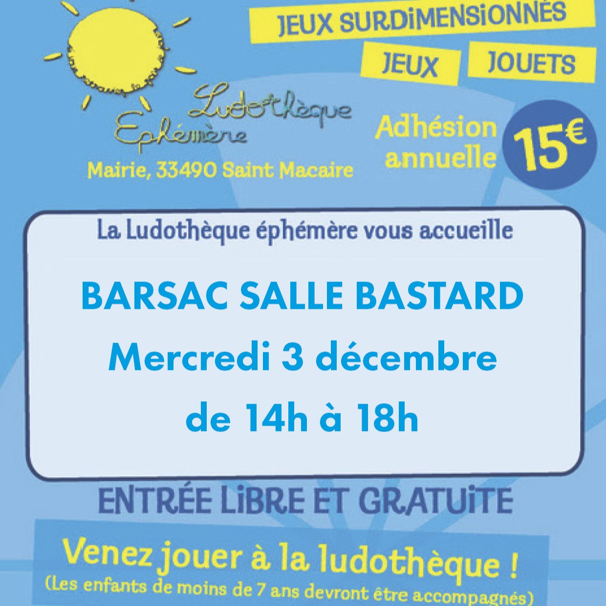 Mercredi 3 décembre L’équipe de la ludothèque éphémère vous accueille à la salle Bastard de 14h à 18h Pour des moments de partage et d’échanges. Pour le plaisir de jouer ensemble. ENTREE LIBRE ET GRATUITE Les enfants de moins de 7 ans doivent être accompagnés. CVLV – 06 78 78 86 39 ludotheque.ephemere33490@gmail.com www.ludotheque-ephemere.com